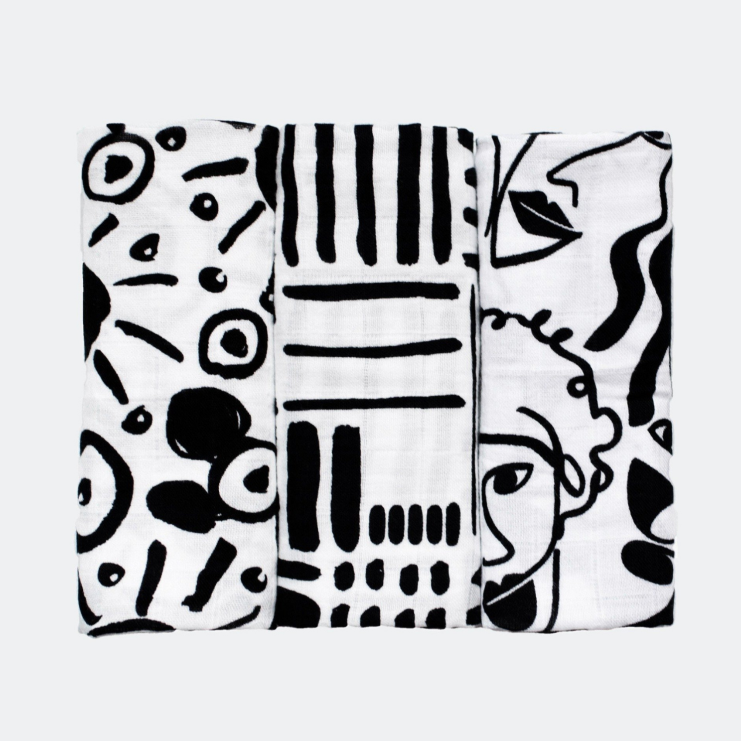 Grab this triple pack of super soft, black and white sensory muslins featuring high contrast patterns. Crafted precisely to aid little ones' cognitive and visual growth from birth up to about four months.