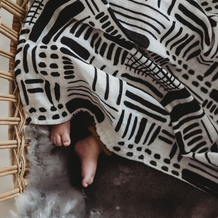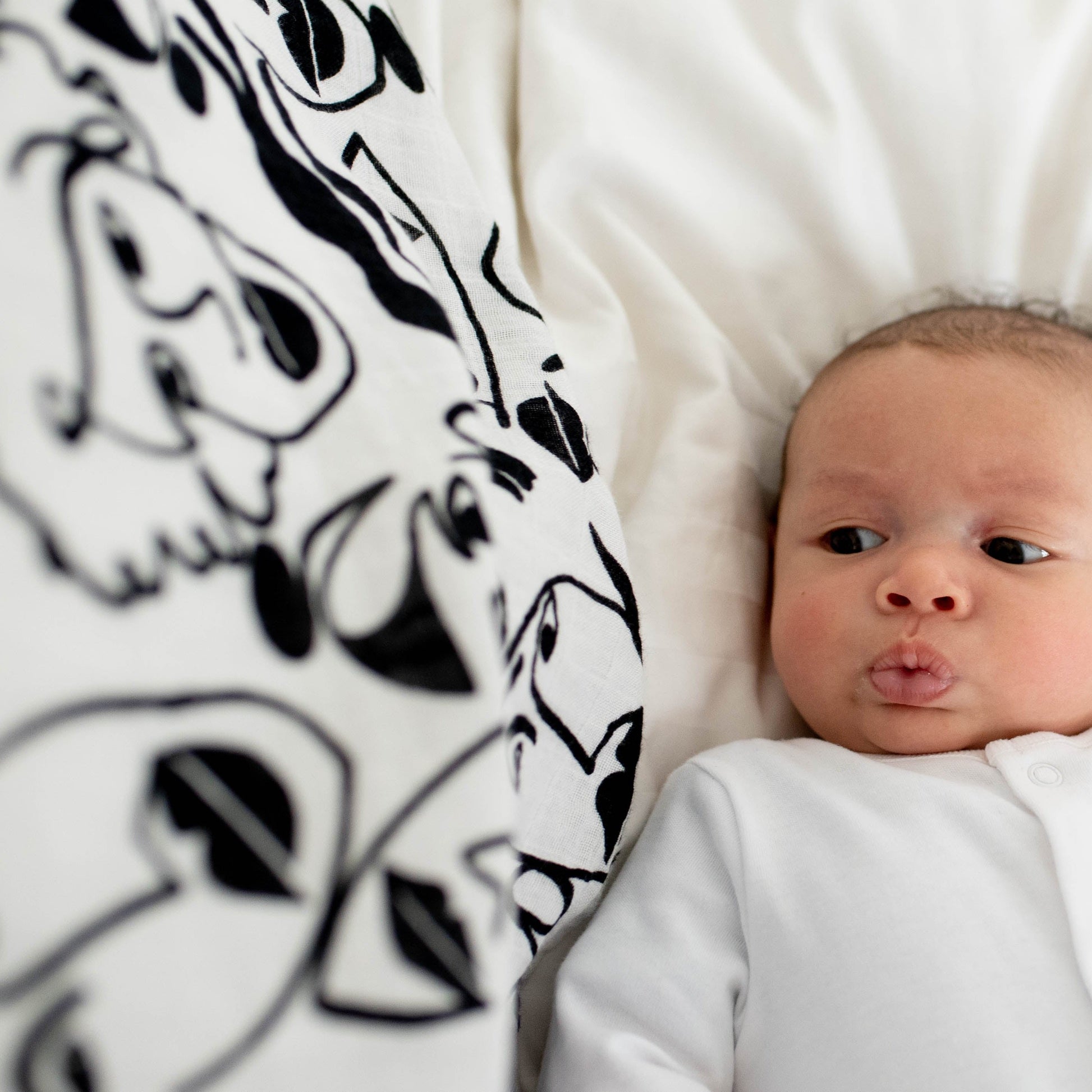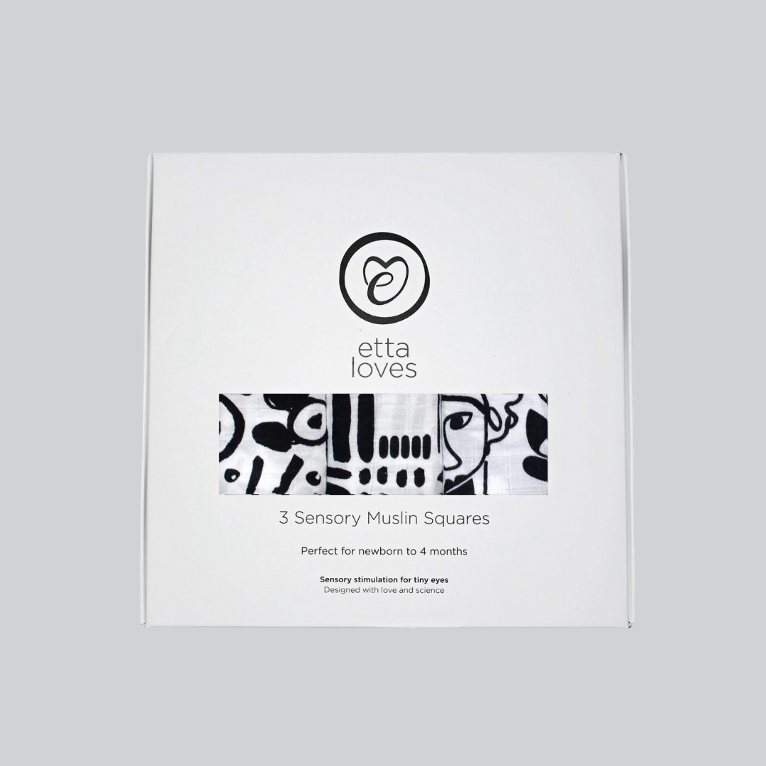 Inside the Etta Loves muslin pack, you'll find three sensory muslin squares - 1 x Lines design, 1 x Eyes design (drawn by Etta herself at just 4 years old), and 1 x Faces design, all beautifully packaged in a stylish box, making it a fab gift for yourself or a fortunate parent-to-be.