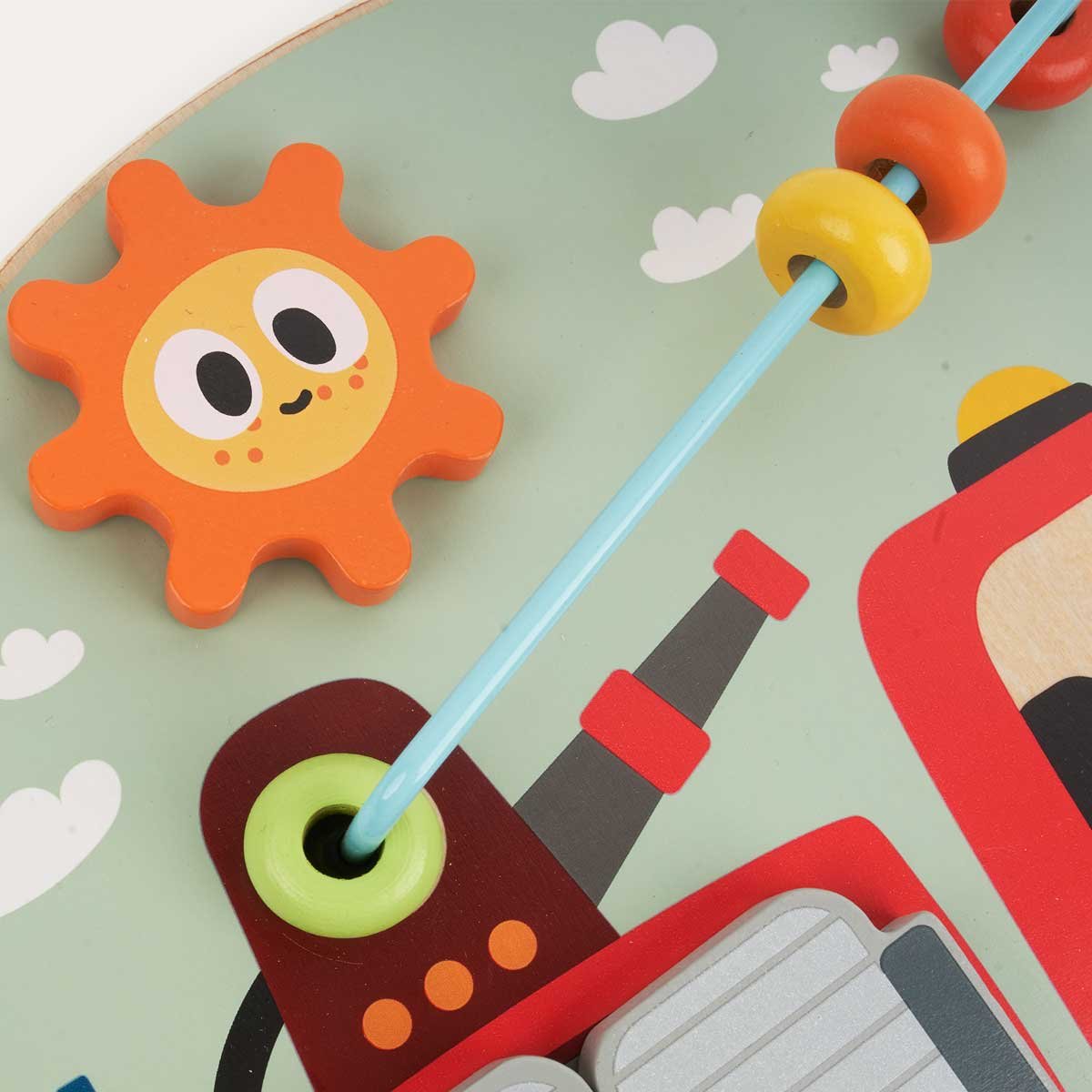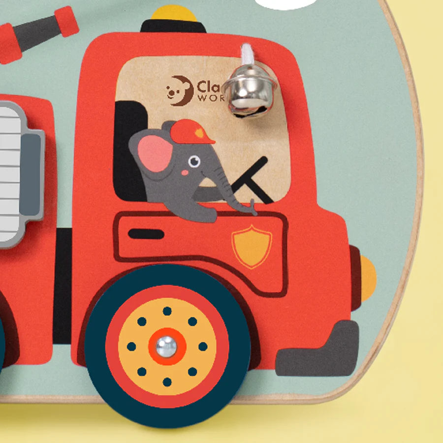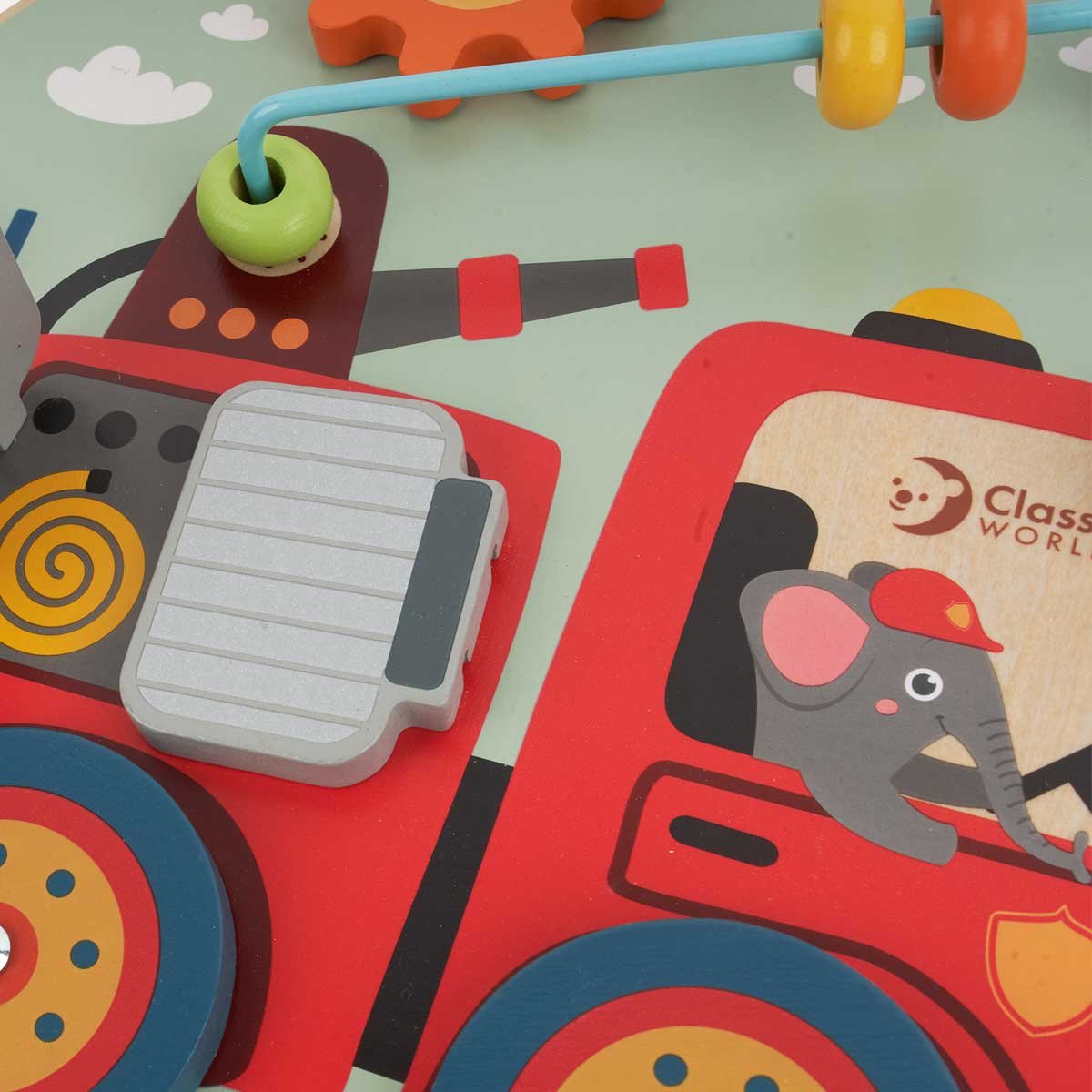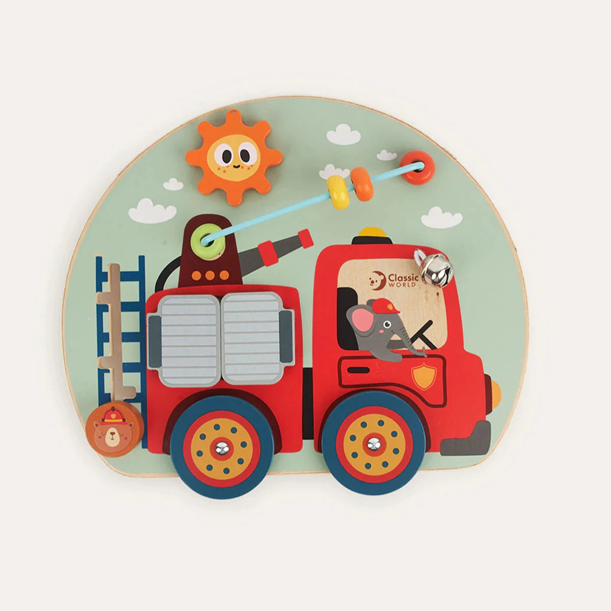 - Featuring a fire engine theme, this busy board has a maze, doors, gears, a bell, and wheels—so much to explore and play with!