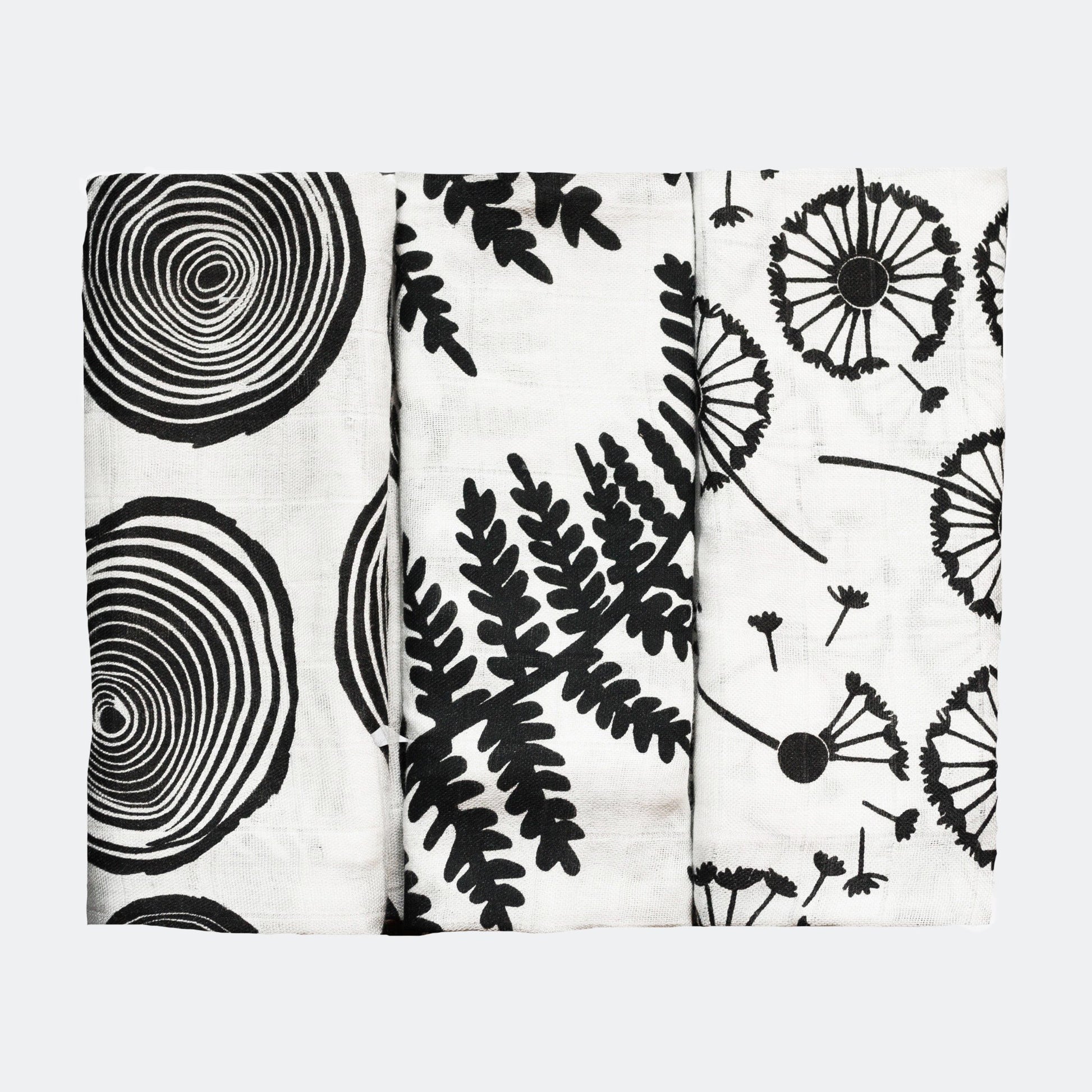 The Plants pack includes a trio of black and white sensory muslin squares in three designs - 1 x fern, 1 x dandelion and 1 x tree ring. Presented in a gorgeous box packaging.