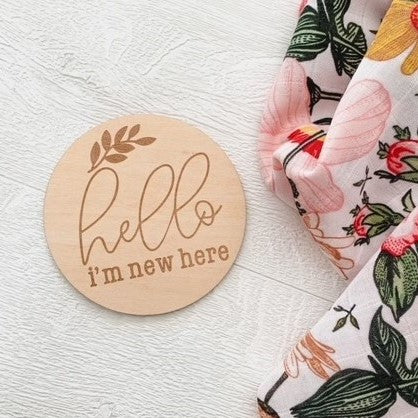 Charming 10cm round wooden disc, 3mm thick, laser engraved with “Hey There, I'm New Here"