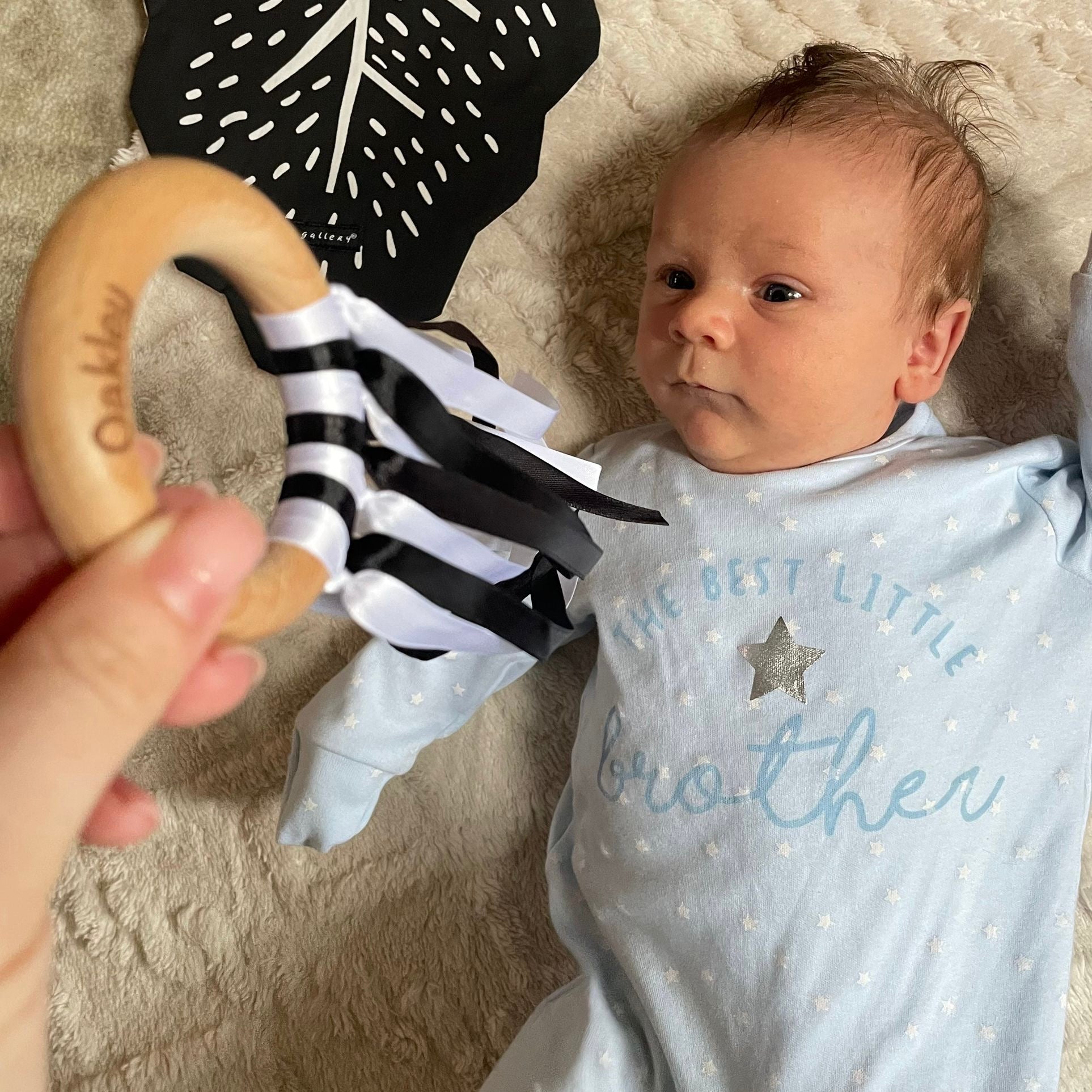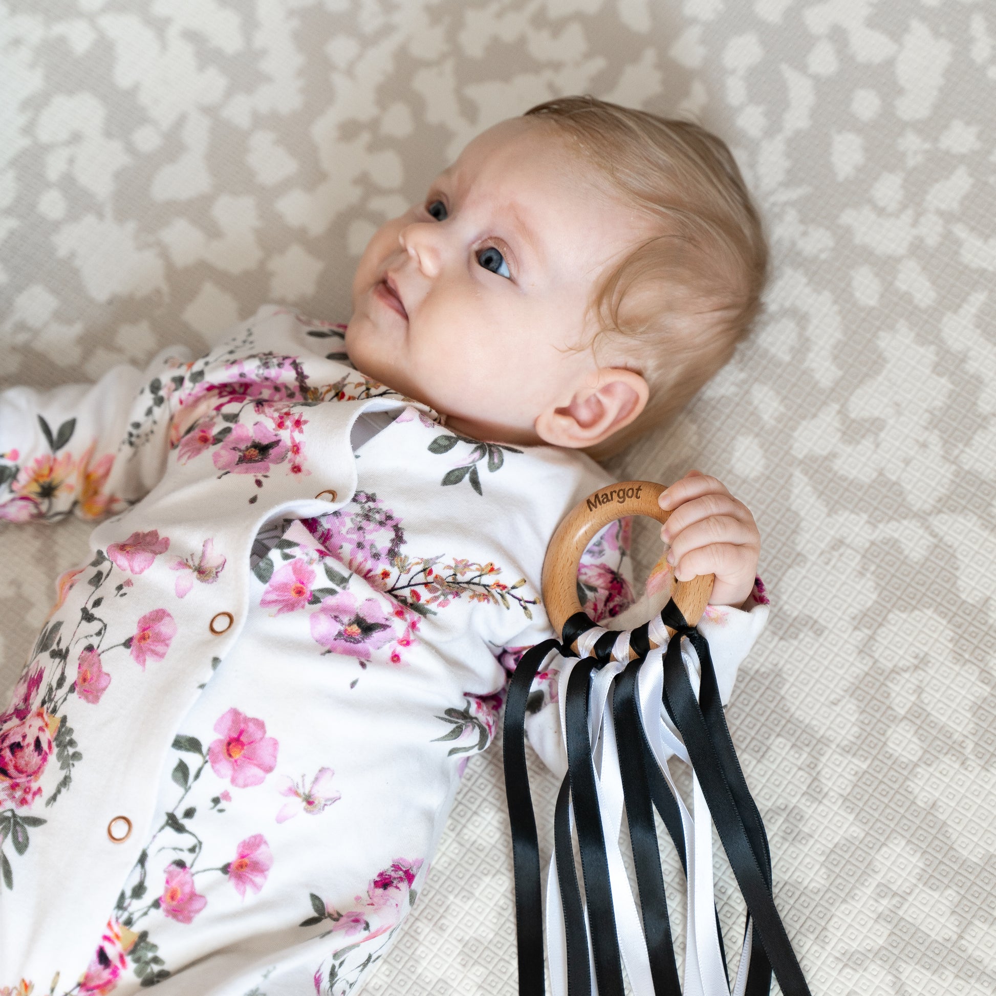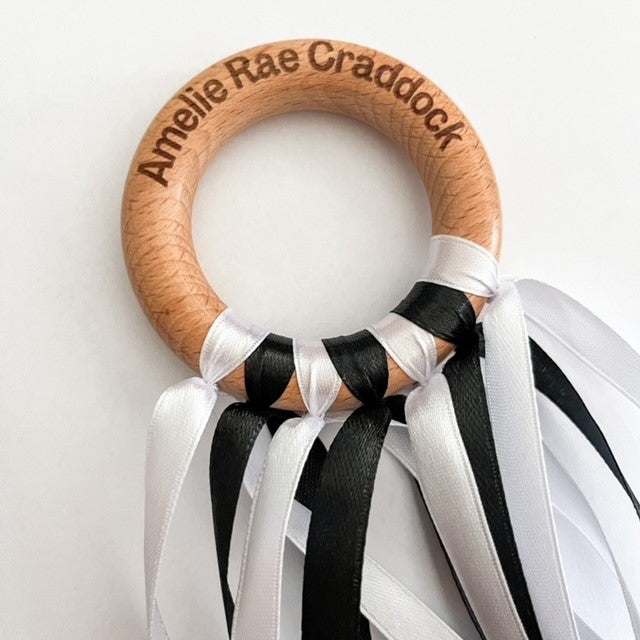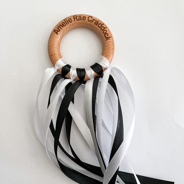 Celebrate your little one's milestones and those oh-so-special moments with our Personalised Sensory Ribbon Ring. It’s got seven monochrome 10mm ribbons that are just perfect. These colours are great for your baby's visual development, helping them focus and concentrate.