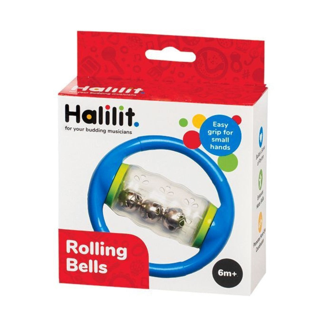 Dive into a world of fun with the Halilit Rolling Bells! This clear spinning tube is packed with jingly bells that make the most delightful sounds as they tumble and twirl. It's got two easy-to-hold handles, perfect for tiny hands to grab and shake, offering a sensory treat that little ones will love.