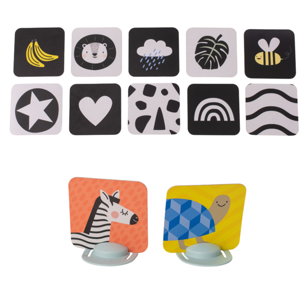 Versatile Card Stands: The tummy time card set includes two unique stands that can be easily attached to any type of baby's play mat. These stands hold the flash cards in position, ensuring they are readily accessible for tummy time play.