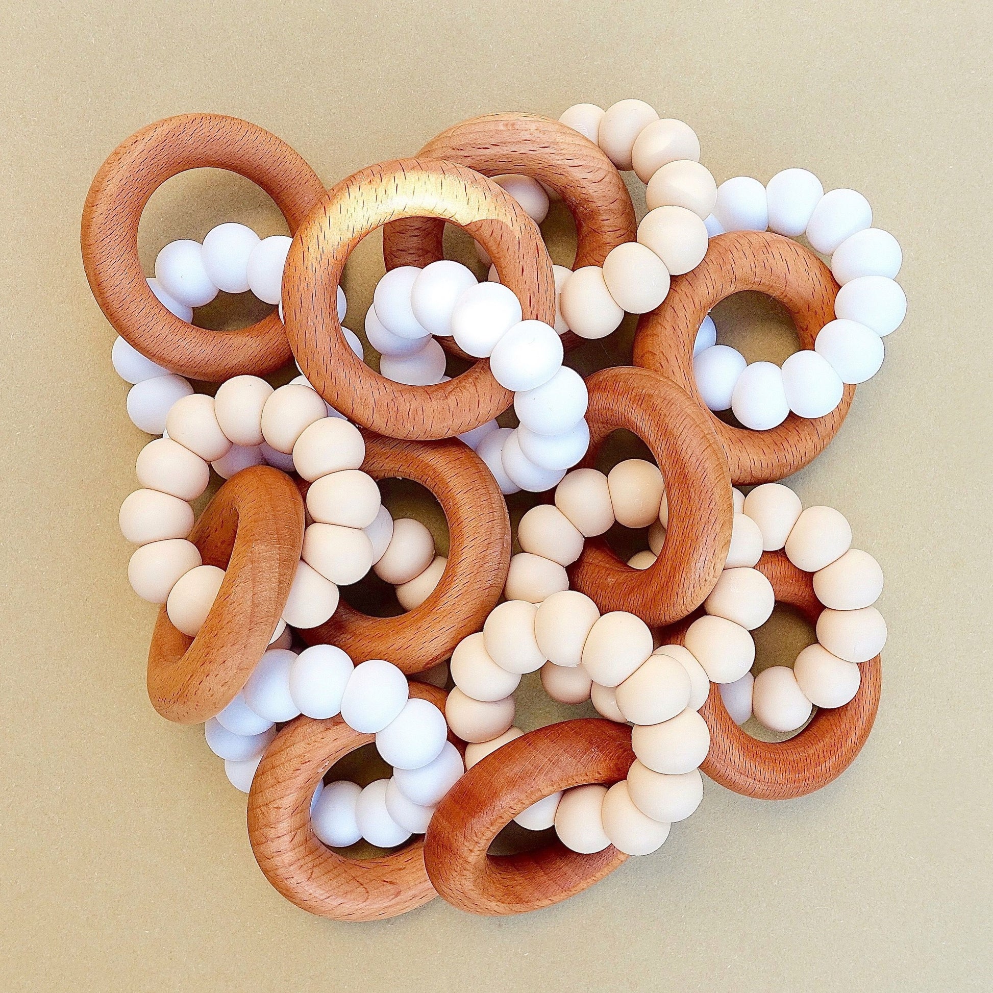 Dual Soothing Action: Our wood and silicone teething rings deliver a double whammy of comfort. The silicone beads help soothe sore gums, while the wooden ring brings relief as those little milk teeth start to break through.