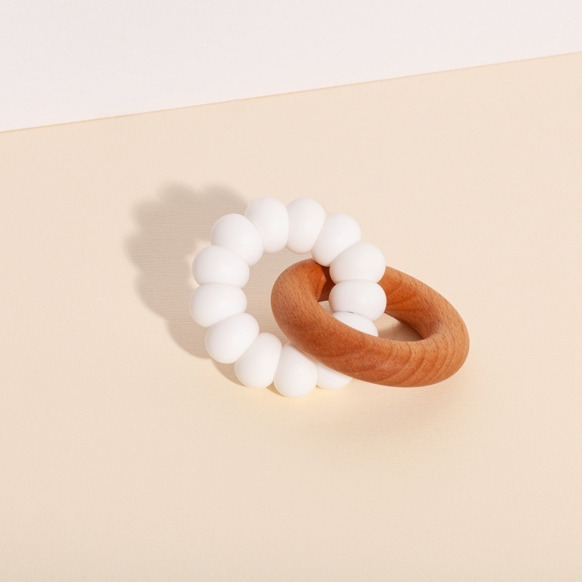 Dual Soothing Action: Our wood and silicone teething rings bring double the soothing. The silicone beads are perfect for easing sore gums, while the wooden ring helps as those little milk teeth start to emerge.