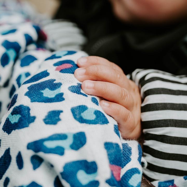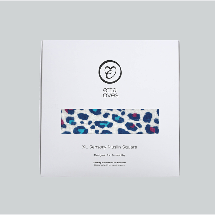 This XL sensory muslin square is super soft, featuring a bold blue and pink leopard print. It’s got those precise scales and vibrant colours that really help with babies' cognitive and visual growth from around 5 months old.