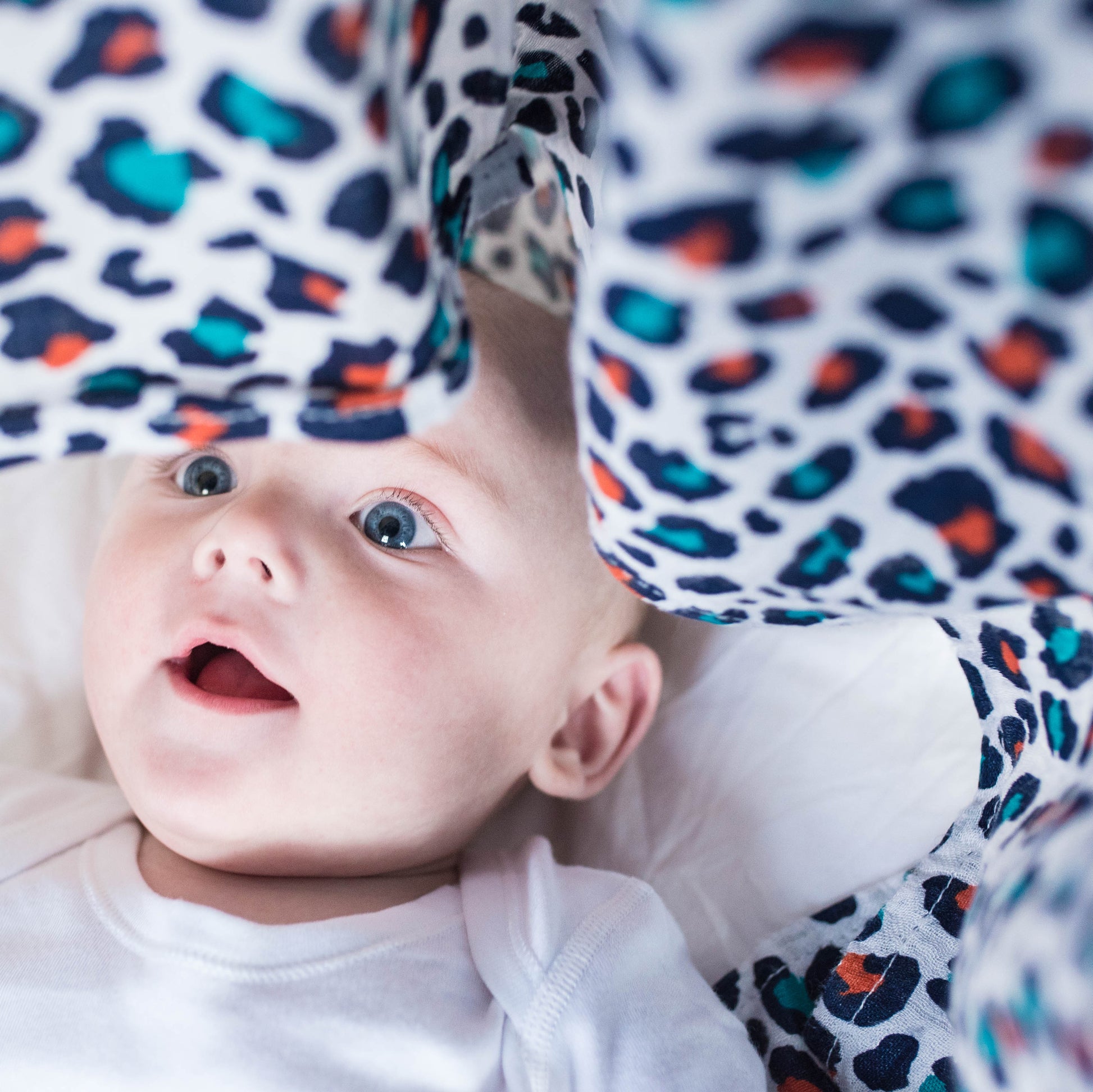 This XL muslin square is super soft and features a bold orange and green leopard print. Crafted with care, the vibrant scales and colours are designed to boost babies' cognitive and visual growth from around 5 months old.